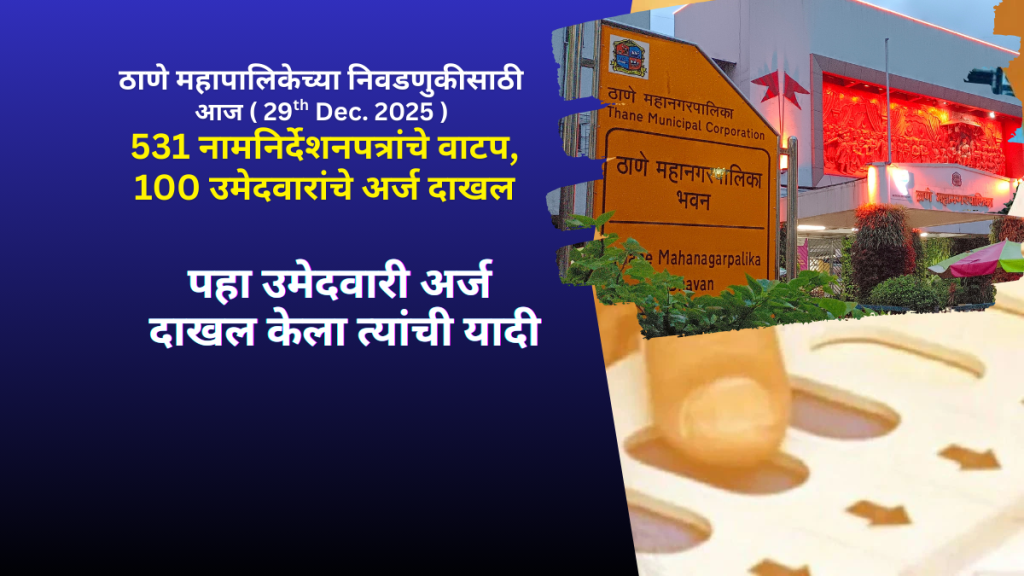 ठाणे (29) ठाणे महानगरपालिका सार्वत्रिक निवडणुकीसाठी आज (29.12.2025) ठाणे शहरातील 9 प्रभागातून आज एकूण 531 नामनिर्देशन पत्रांचे वाटप करण्यात आले असल्याची माहिती प्रभागसमितीनिहाय नियुक्त करण्यात आलेल्या निवडणूक निर्णय अधिकाऱ्यांनी दिली.
