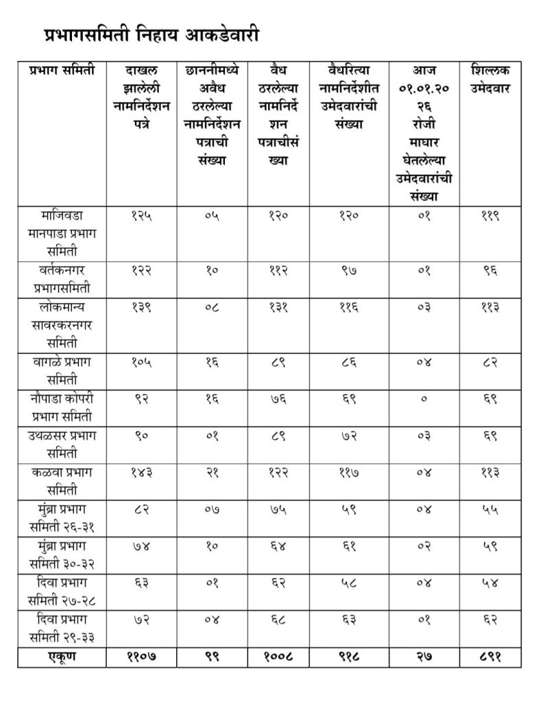 ठाणे (01) : येत्या 15 जानेवारी 2026 रोजी होत असलेल्या ठाणे महानगरपालिका सार्वत्रिक निवडणुकीसाठी 9 प्रभाग समिती मधील 11 निवडणूक निर्णय अधिकारी यांच्याकडे विविध राजकीय पक्ष व अपक्ष मिळून एकूण 1107 नामनिर्देशनपत्रे 30 डिसेंबर 2025 पर्यंत दाखल झाले होते.