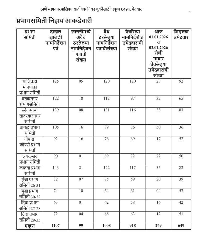 ठाणे (02) : येत्या 15 जानेवारी 2026 रोजी होत असलेल्या ठाणे महानगरपालिका सार्वत्रिक निवडणुकीसाठी 9 प्रभागसमिती मधून माघार घेतलेल्या उमेदवाराअंती एकूण 649 उमेदवार निवडणुकीच्या रिंगणात आहेत. 9 प्रभागसमितीमधून एकूण 1107 नामनिर्देशनपत्रे 30 डिसेंबर 2025 पर्यंत दाखल झाली होती . 1 व 2 जानेवारी रोजी मिळून एकूण 269 उमेदवारांनी माघार घेतल्याने आता 649 उमेदवार निवडणुकीच्या रिंगणात आहेत.